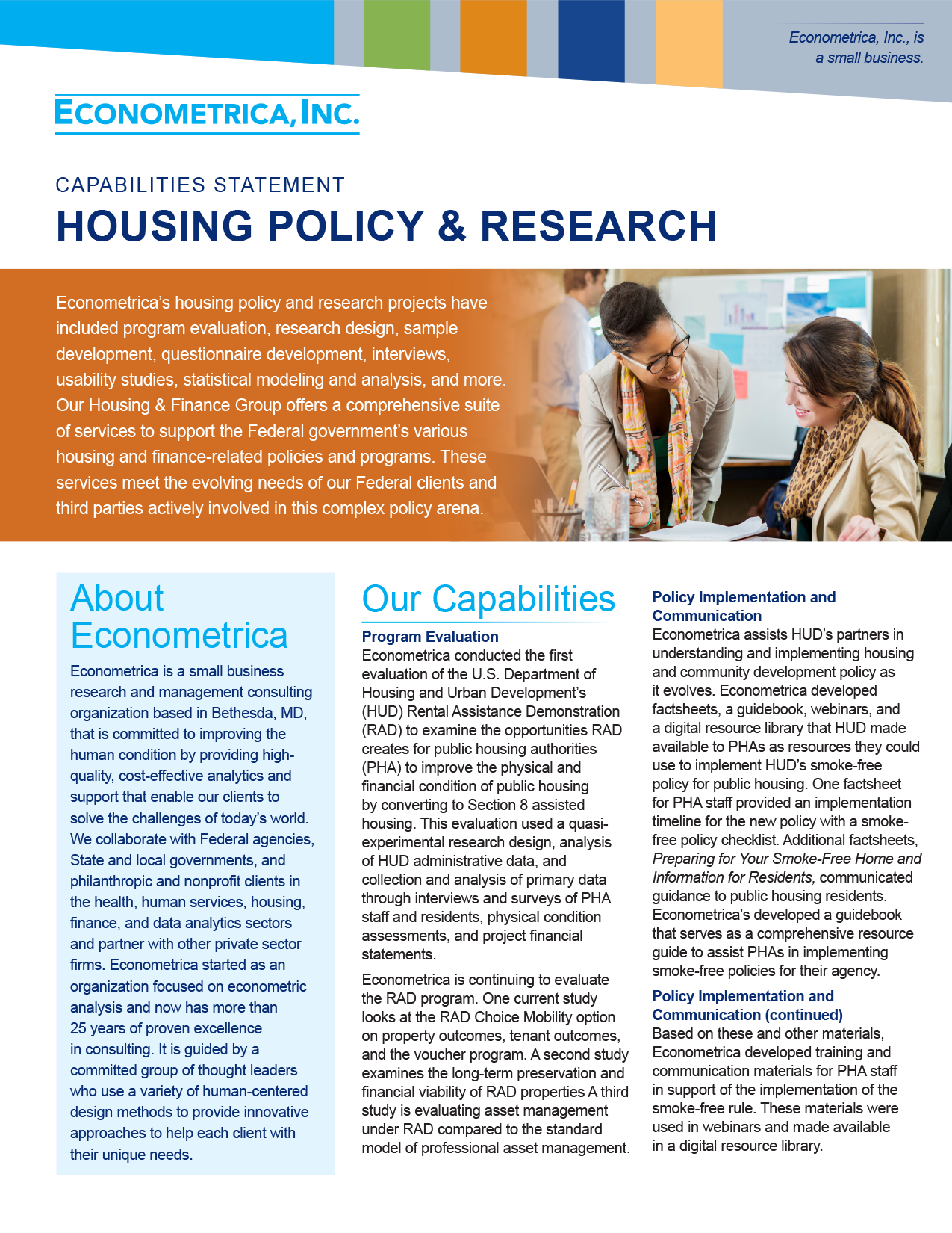 The Housing & Finance Group encompasses multiple experts in a broad array of Federal agency housing programs and financing tools. Econometrica maintains a strong base of in-house expertise that can be augmented by contracted subject matter experts.
