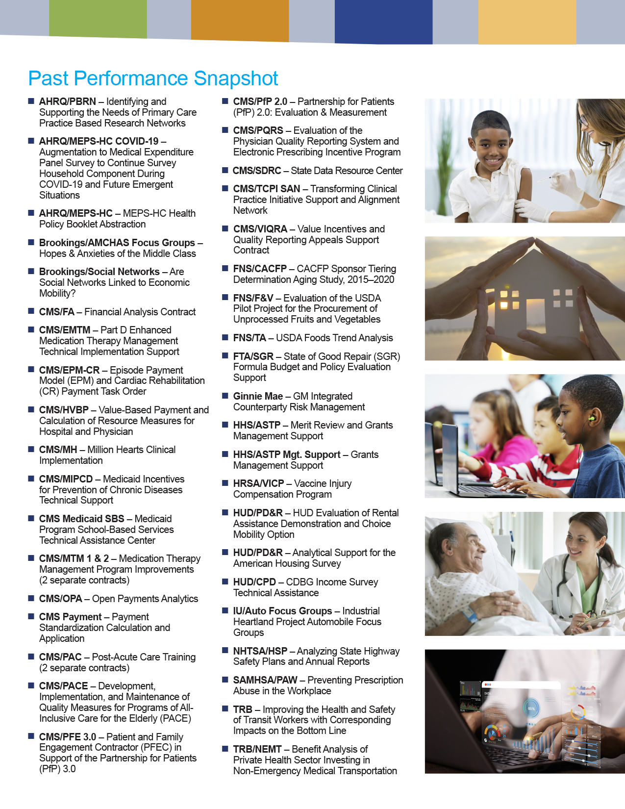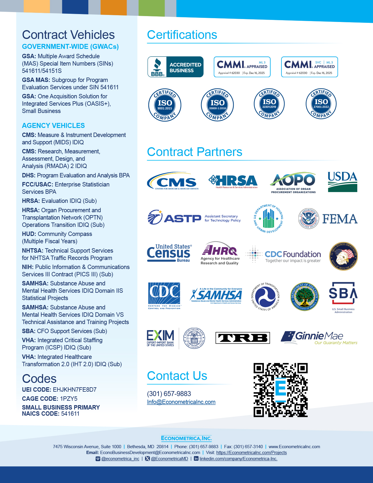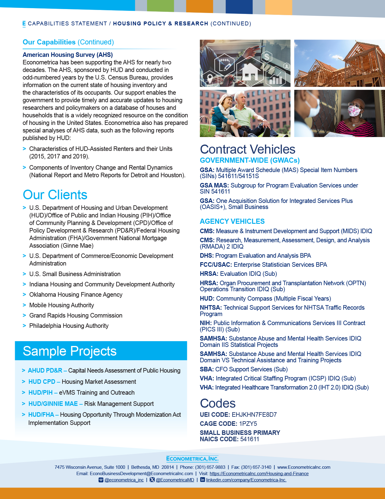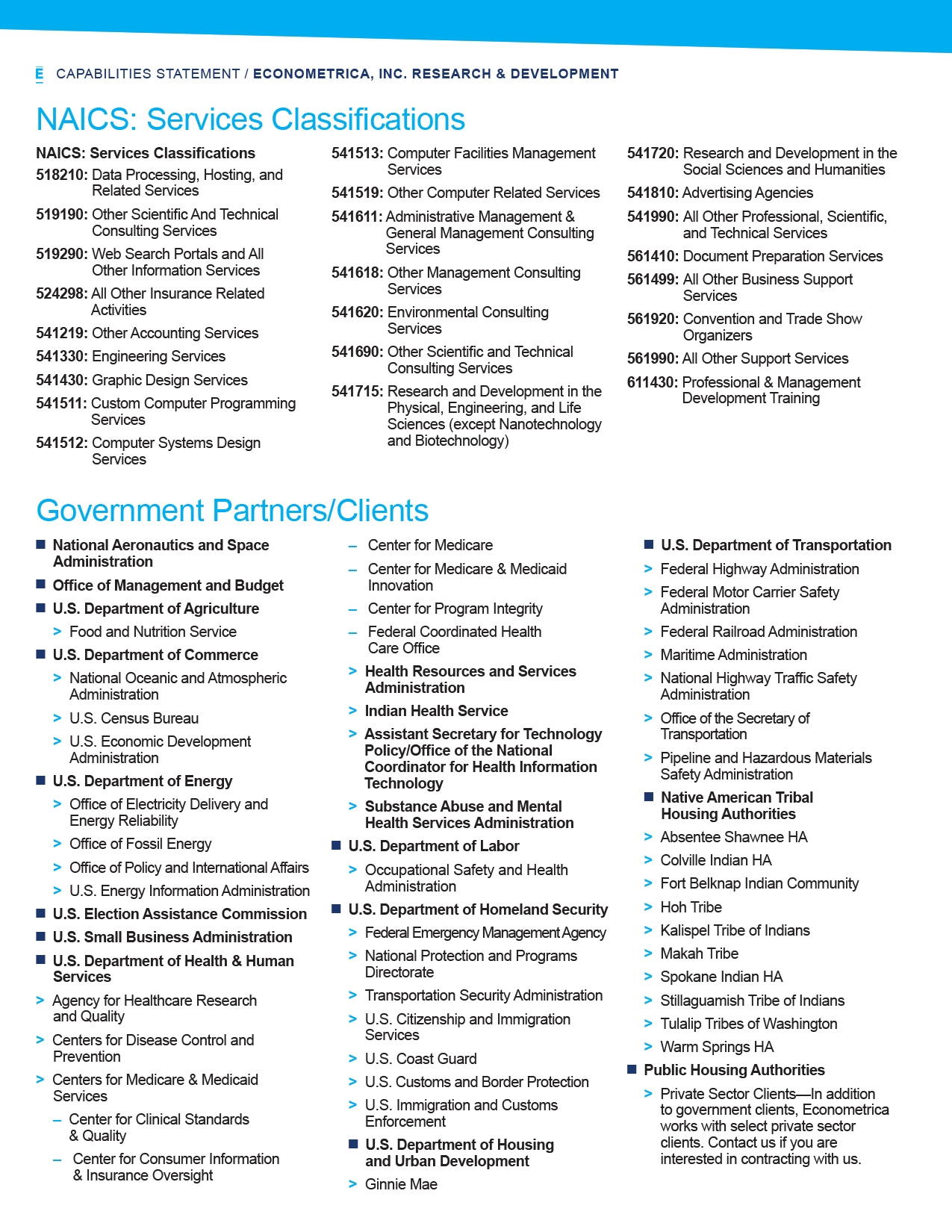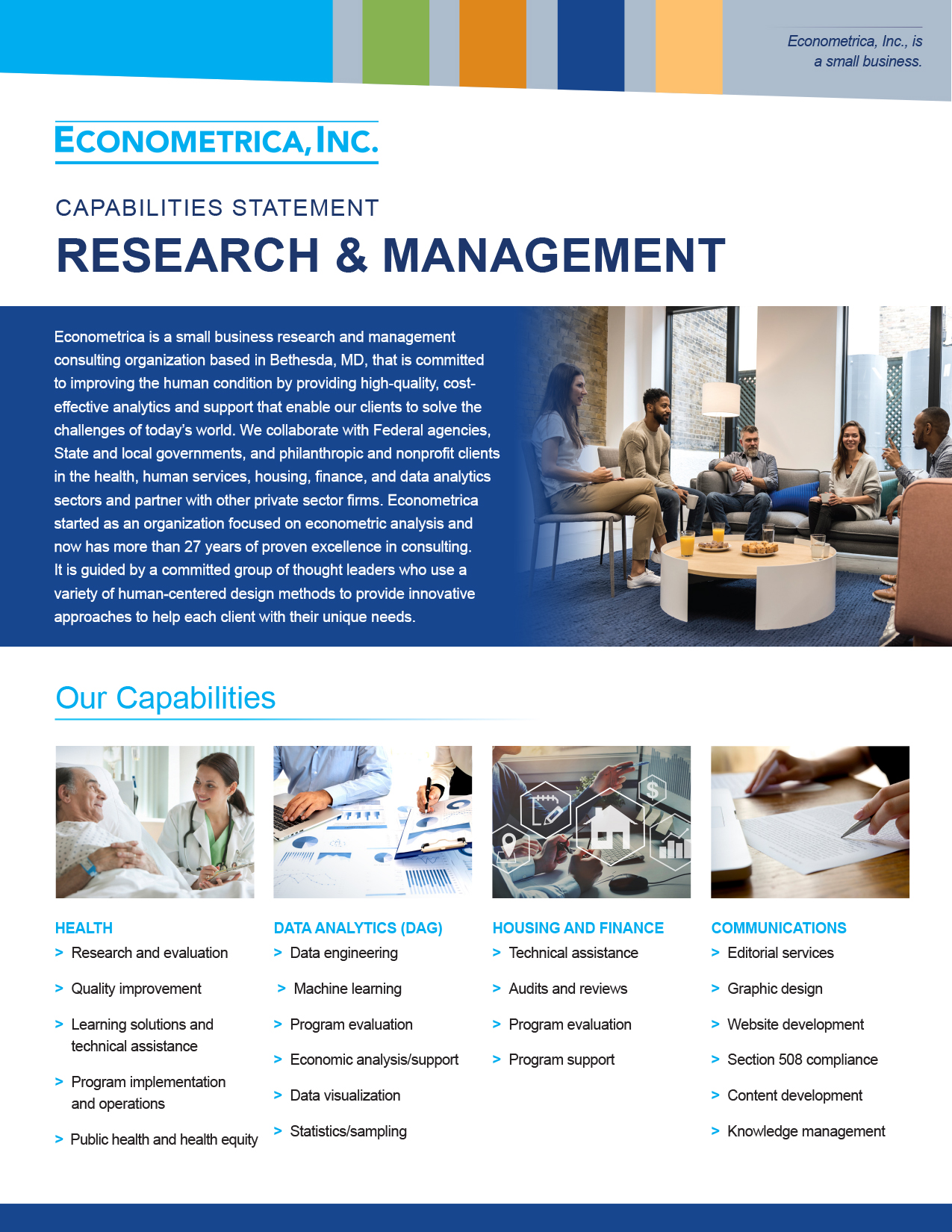 Econometrica collaborates with Federal agencies, State and local governments, and philanthropic and nonprofit clients in the health, human services, housing, finance, and data analytics sectors and partner with other private sector firms. Our capability statements, also found elsewhere on our website, are below.