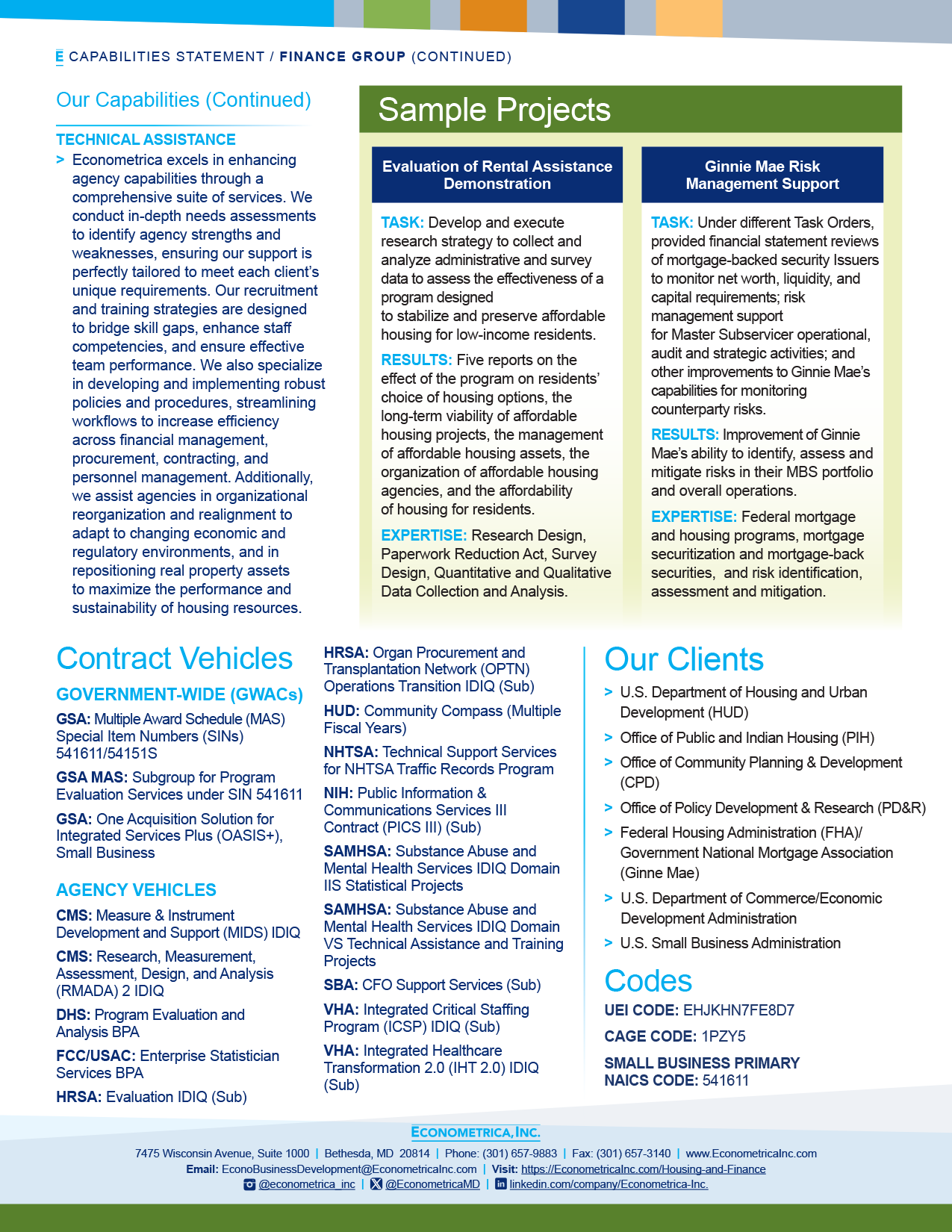 The Housing & Finance Group encompasses multiple experts in a broad array of Federal agency housing programs and financing tools. Econometrica maintains a strong base of in-house expertise that can be augmented by contracted subject matter experts.
